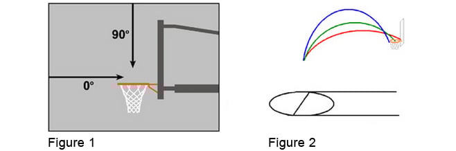 If a ball enters the hoop directly from above, as in Figure 1, this is a 90 degree arc. Unless you are dunking the ball, a 90 degree arc is impossible. Free throws and jump shots always come into the hoop at an angle. A ball entering the hoop directly from the side is a 0 degree arc, which is impossible to score.