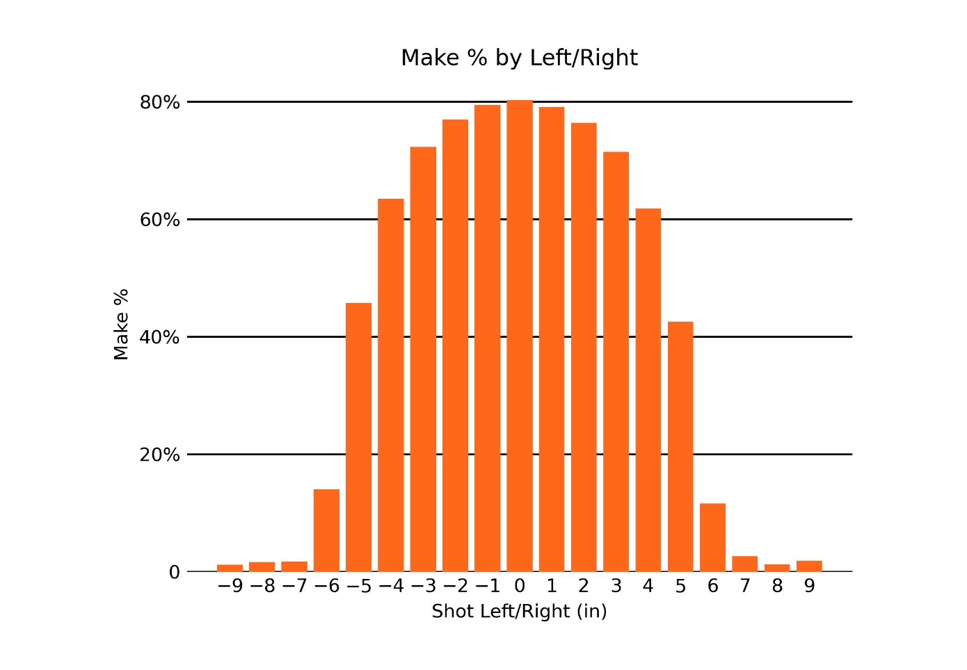 The chart to the left shows make percentage by left/right deviation for millions of shots. Nothing surprising here—shooting the ball straight will result in a higher make percentage. Strive to keep the ball in the Splashzone (±3”) to minimize misses caused by left/right misalignment.